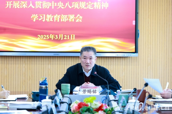 劳赐铭强调,这次学习教育时间紧、任务重,各级党组织要切实扛起主体责任,推进学习教育各项任务落实落细。提高站位、凝聚共识,深刻认识开展学习教育的重要意义。开展深入贯彻中央八项规定精神学习教育,是巩固主题教育和党纪学习教育成果、纵深推进全面从严治党的重要举措,是践行党的根本宗旨、巩固党的执政基础的现实需要,全校党员、特别是领导干部要充分认识此次学习教育的重要意义,切实提高政治站位,切实增强开展学习教育的思想自觉、政治自觉、行动自觉。突出重点、抓住关键,准确把握学习教育的目标要求和具体任务。学校各级党组织和党员、干部要牢牢把握总体要求、紧紧锚定目标任务、扎扎实实真学真做真改,一体推进“学、查、改、促”,坚持开门教育,确保学有质量、查有力度、改有成效。加强领导、精心组织,确保学校学习教育有力有效开展。要“一把手”带头,压紧压实责任,细化学校实施方案要求,突出“实”的导向;要“一根弦”紧绷,坚持求真务实,要将学习教育与校院两级中心工作深度融合,坚决防止“两张皮”;要“一盘棋”推进,积极宣传引导,坚持正面引导与反面警示相结合,确保学习教育健康有序、取得实效。